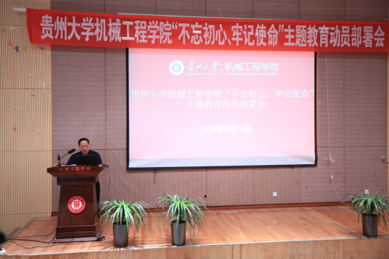 2019年9月25日,貴州大學(xué)機(jī)械工程學(xué)院黨委“不忘初心,牢記使命”主題教育部署會(huì)在機(jī)械樓圓形報(bào)告順利召開。校巡回指導(dǎo)小組四組組長(zhǎng)許道云、成員李臣宇以及學(xué)院及現(xiàn)代制造重點(diǎn)實(shí)驗(yàn)室在家處級(jí)領(lǐng)導(dǎo)干部、院黨委委員、各黨總支、黨支部委員、全體師生黨員參加了此次會(huì)議。會(huì)議由學(xué)院黨委院長(zhǎng)李少波主持。