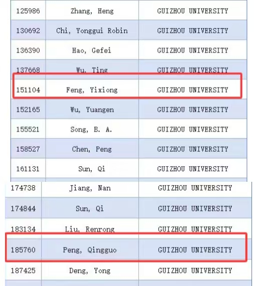 2025年9月19日,美國(guó)斯坦福大學(xué)(Stanford University)與愛思唯爾(Elsevier)聯(lián)合發(fā)布了第八版《全球前2%頂尖科學(xué)家榜單2025》(World’s Top 2% Scientists 2025)。該榜單依托Scopus數(shù)據(jù)庫(kù)的引用數(shù)據(jù)進(jìn)行系統(tǒng)分析,從全球近700萬(wàn)名科學(xué)家中,依據(jù)“生涯影響力”和“年度影響力”兩項(xiàng)指標(biāo),遴選出世界排名前2%的頂尖科學(xué)家。其中,中國(guó)有12374位學(xué)者入選“終身榜”,31685位學(xué)者入選 “2025 年度榜”。我院馮毅雄教授、彭慶國(guó)副教授亦榜上有名,成功入選2025年全球前2%頂尖科學(xué)家“年度影響力”榜單,如圖1所示。