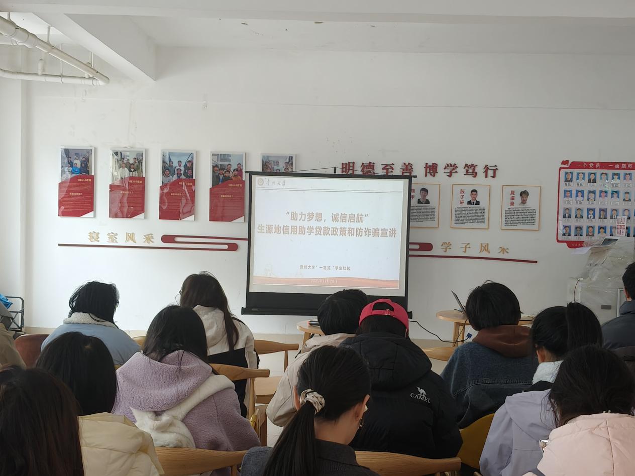 機(jī)械工程網(wǎng)站訊(文/楊朵圖/王則皓)為做好生源地信用助學(xué)貸款政策宣傳,增強(qiáng)學(xué)生誠(chéng)信還貸與防詐騙意識(shí),2025年11月20日中午,貴州大學(xué)機(jī)械工程學(xué)院聯(lián)合國(guó)家開發(fā)銀行貴州省分行、貴州大學(xué)學(xué)生資助管理中心在西一區(qū)6棟一樓大廳舉辦“一站式”學(xué)生社區(qū)之“助力夢(mèng)想,誠(chéng)信啟航”生源地信用助學(xué)貸款政策和防詐騙宣講會(huì)。國(guó)家開發(fā)銀行貴州省分行客戶三處三級(jí)經(jīng)理董婷婷主講,貴州大學(xué)學(xué)生資助管理中心副主任鄭嵐、機(jī)械工程學(xué)院黨委副書記廖燁、貴州大學(xué)學(xué)生資助管理中心相關(guān)科室負(fù)責(zé)人、機(jī)械工程學(xué)院輔導(dǎo)員代表與學(xué)生代表共40余人參與。